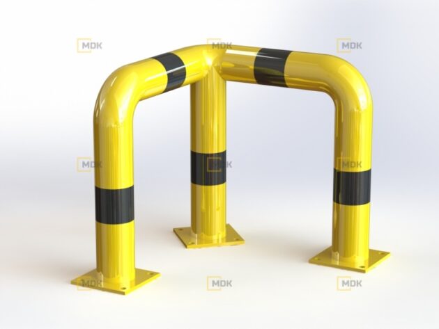 Obloukový nárazník rohový je vyroben z oceli S235. Povrchová úprava je řešena práškovou barvou. Žlutá dopravní barva RAL1023 zvyšuje viditelnost nárazníku a varuje před překážkami, což přispívá k vyšší bezpečnosti. Ocelové patky nárazníku jsou vyrobeny z plechů o tloušťce 10 mm. Kotevní otvory Ø 16 mm. Nárazník má černé reflexní šrafování.